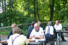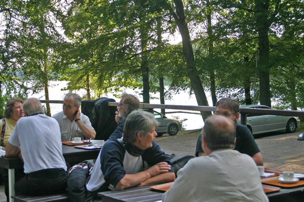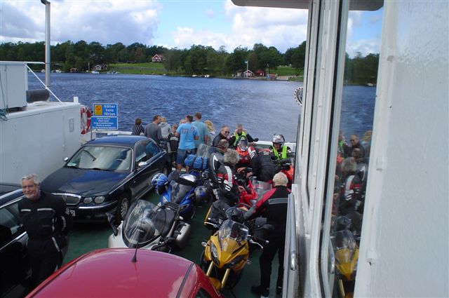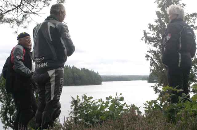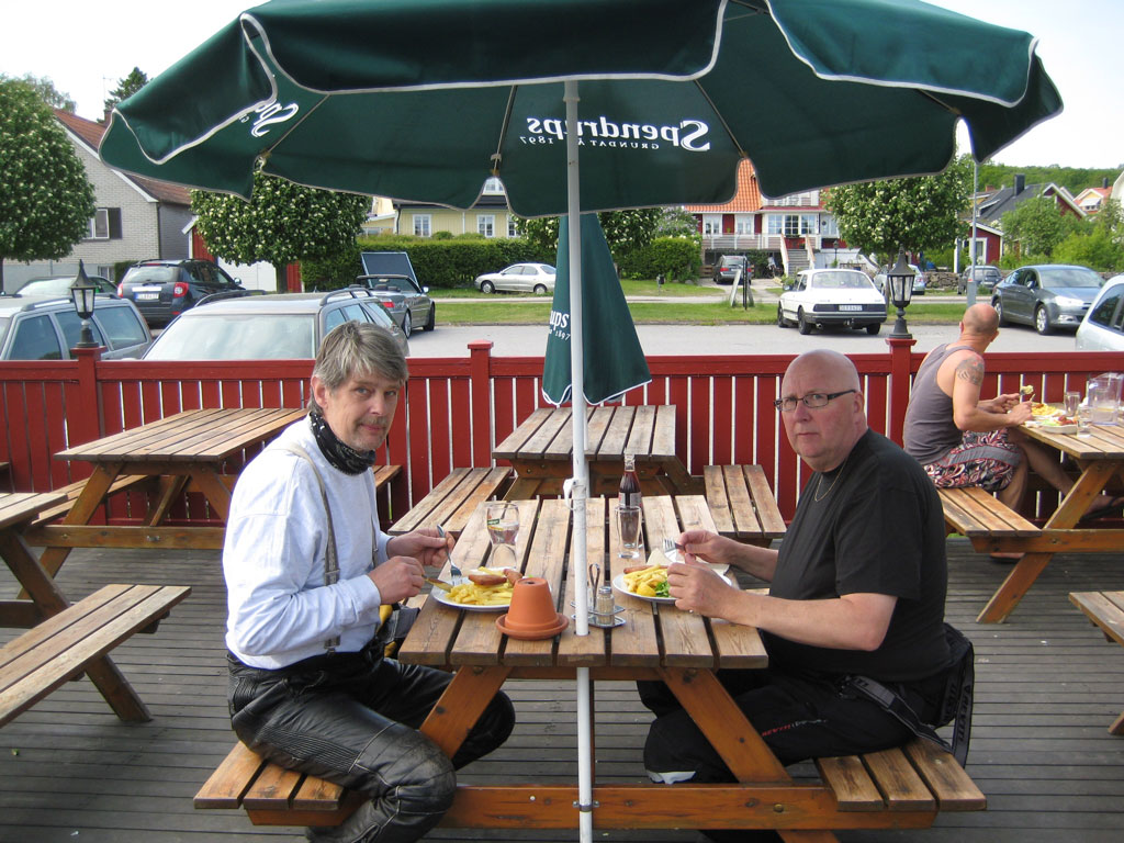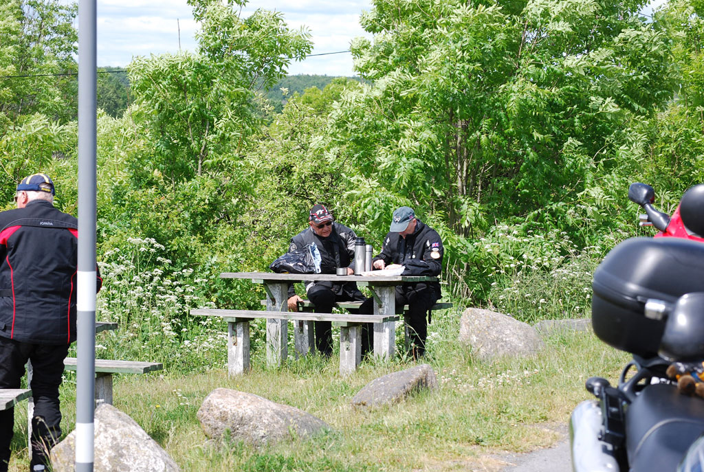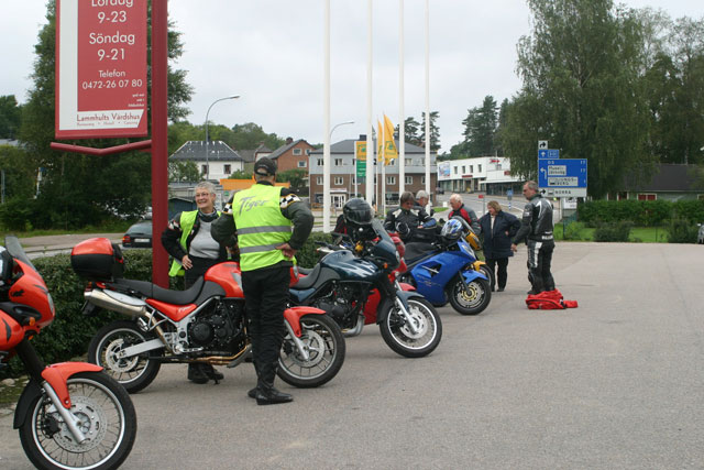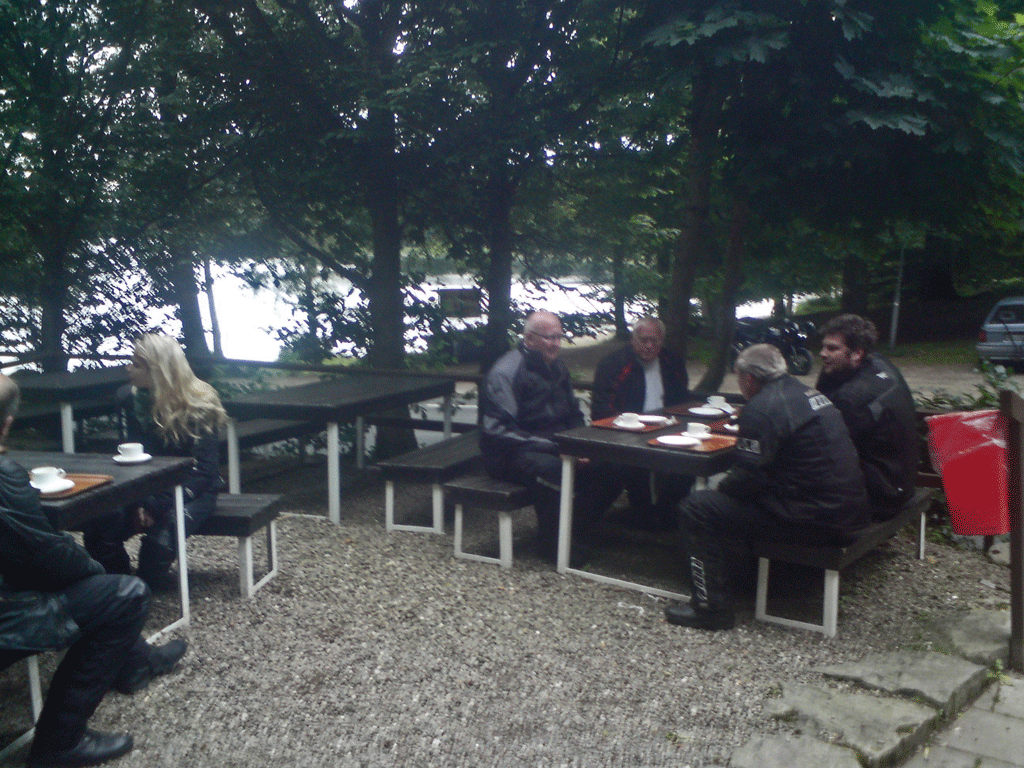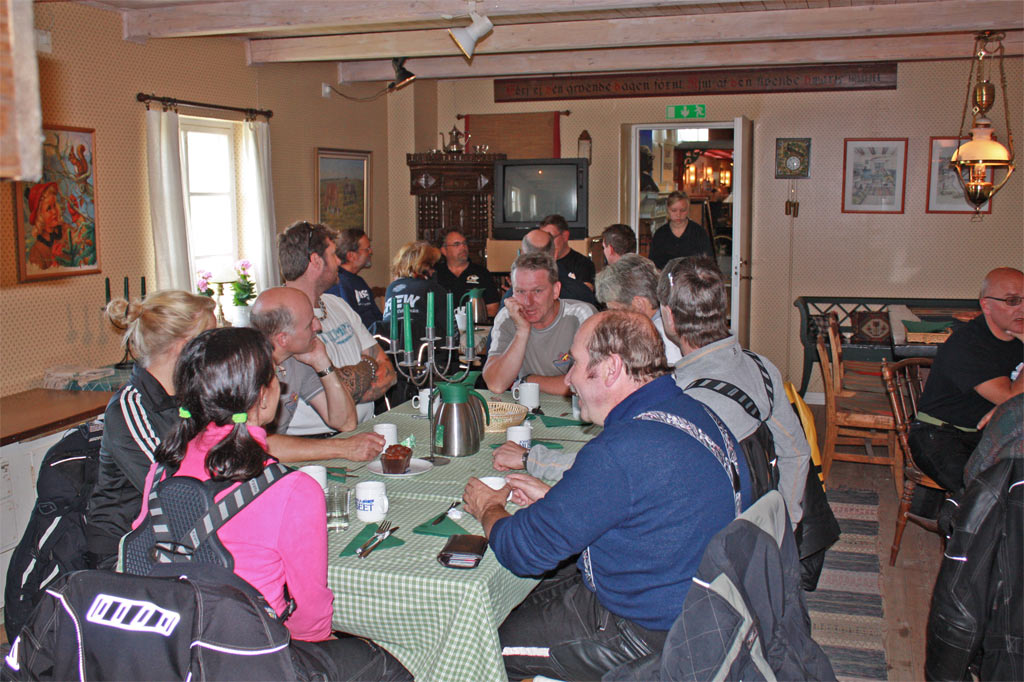 Vi fortsatte mot och längs Riksettan tills vi hittade ett trevligt matställe vid en sjö. Nu är det väl ingen större prestation att hitta sjöar i Småland men det var ett mycket vackert ställe. Vi beställde och under tiden anlände svärmar av mc-åkare och maten serverades av en tös med begränsad erfarenhet av Sverige. Lite underhållande var när hon sa, jag vet inte vad det är, men maten hitta rätt i alla fall. Goa mc-vägar igen som förde oss in i kända trakter där vi skildes åt mot våra olika mål. Vi var alla mycket tacksamma för det fina arbetet som Dick hade lagt ner.