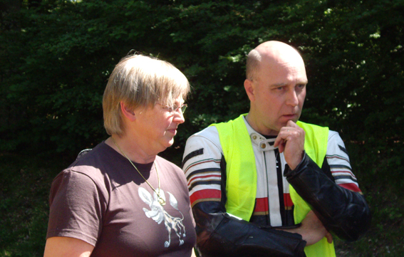 Stämningen blev ännu bättre och Rolf tog upp sitt problem med ryckig gång från låga varv i utgången i kurvor. Nej, inte det vanliga som beror på att fotpinnen gräver ner sig under nerlägget utan något annat. Vi rösta på förgasarfnatt, Rolf bestämt på tändningstrams. Acke började bli lite uppjagad för han hade kört den och hittade inget problem. Ja det började nästan hetta till. Då kom räddningen, Susanne lät honom snaska på hennes jungfrubröst, och se, nu blev han en mysgubbe igen.