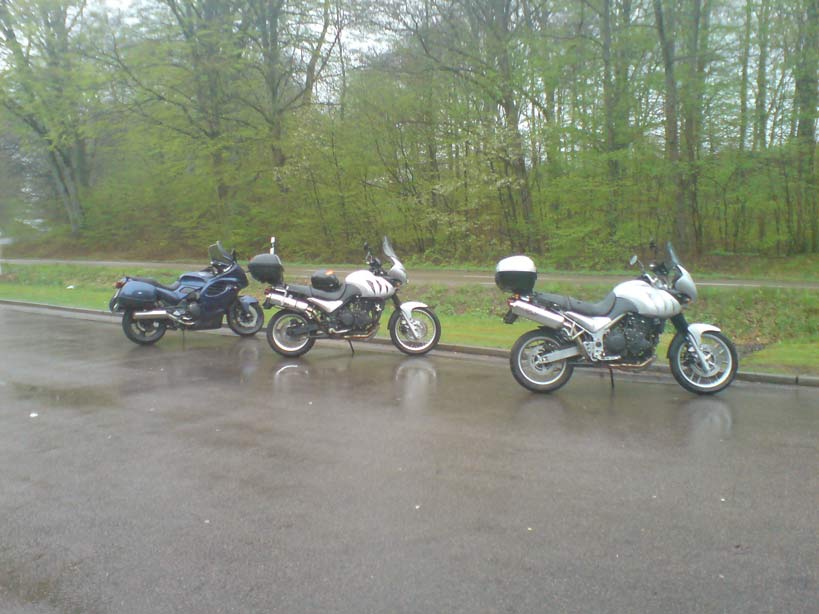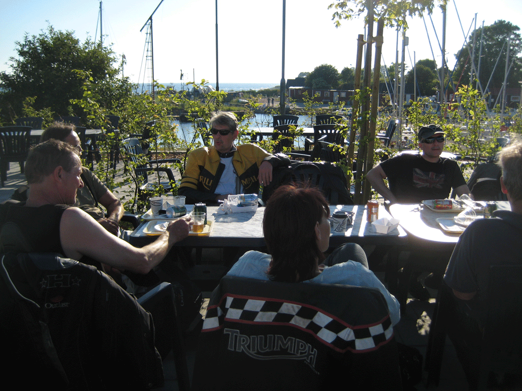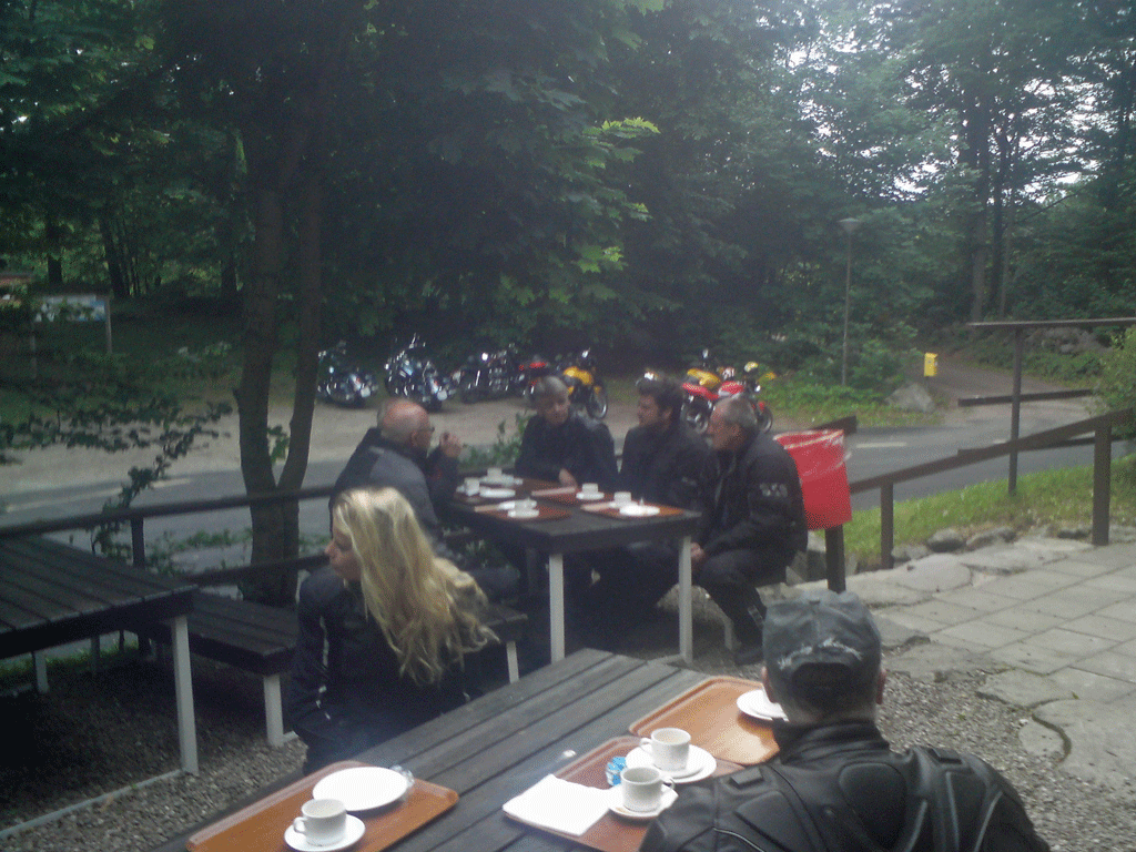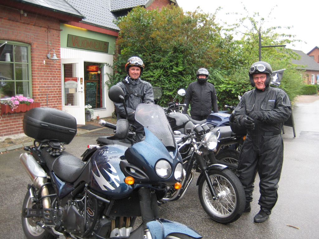 När de väl hade stannat fick vi till vår glädje se att där fanns ytterliggare en medlem, det var Jonny som hade hittat sjöjungfrun i Bosarp som villigt serverade kaffe till oss också, men säg den lycka som varar, efter en stund öppnade himlen sig så vi fick söka oss inomhus till sjöjungfrun för att fortsätta våra diskussioner. Våra Triumph-gudar har vi ju med oss för det mesta så innan vi (fyra) skulle köra hem hade himlen klarnat upp.