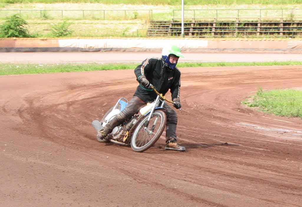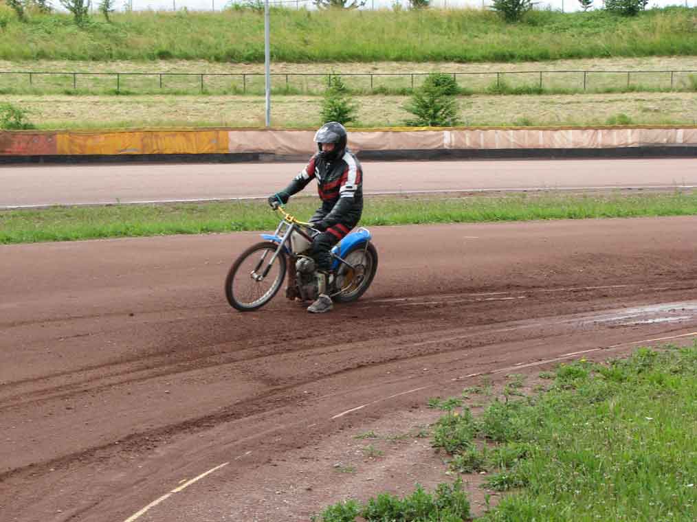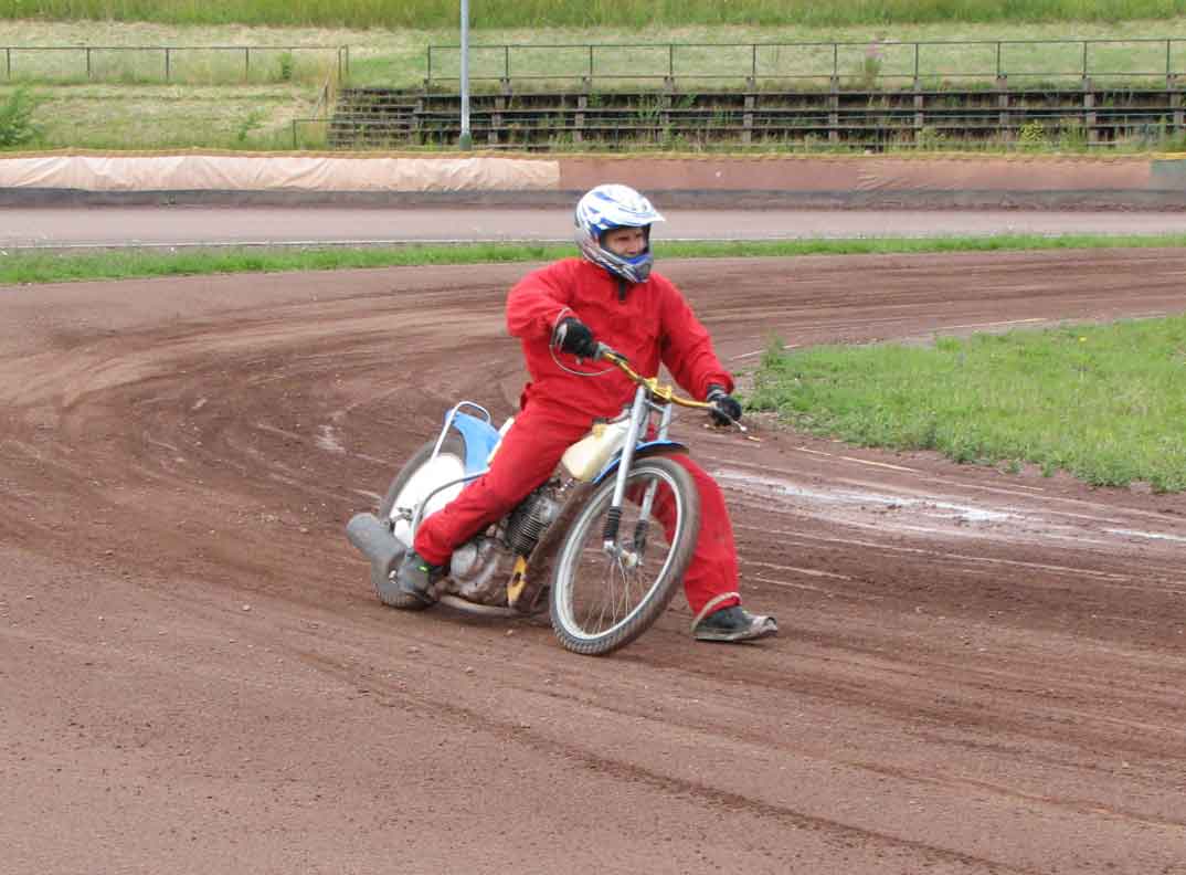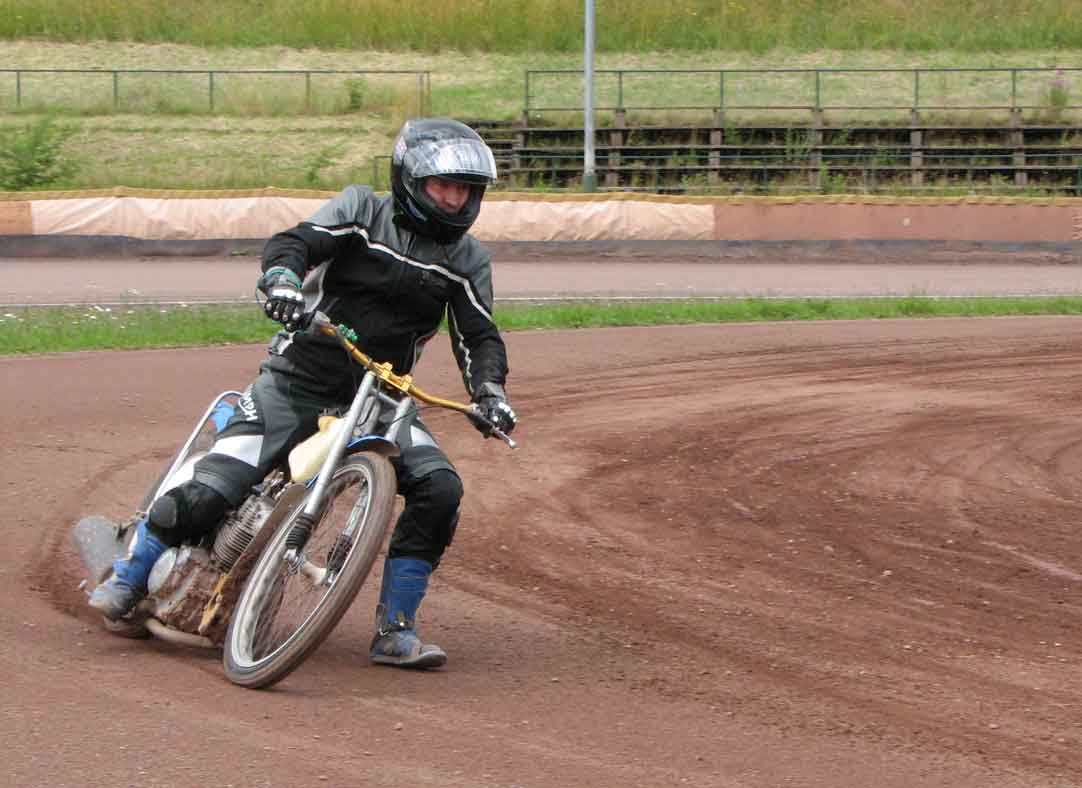 Ett gäng gasglada Hinckley-åkare och några andra entusiaster samlades på Malmö Motorstadion för att pröva på en mc-sport där man kör cykel utan broms (kanske en fördel för undertecknad) och med ständig sladd, vilket av många kan tyckas vansinnigt. Dick instruerade oss i denna konst med budskapet att aldrig släppa på gasen, och det kan ju behövas för oss som normalt kör lite snabbare maskiner än honom och därför får vara lite försiktiga med gashandtaget.