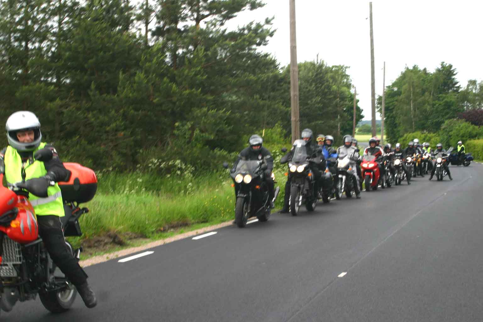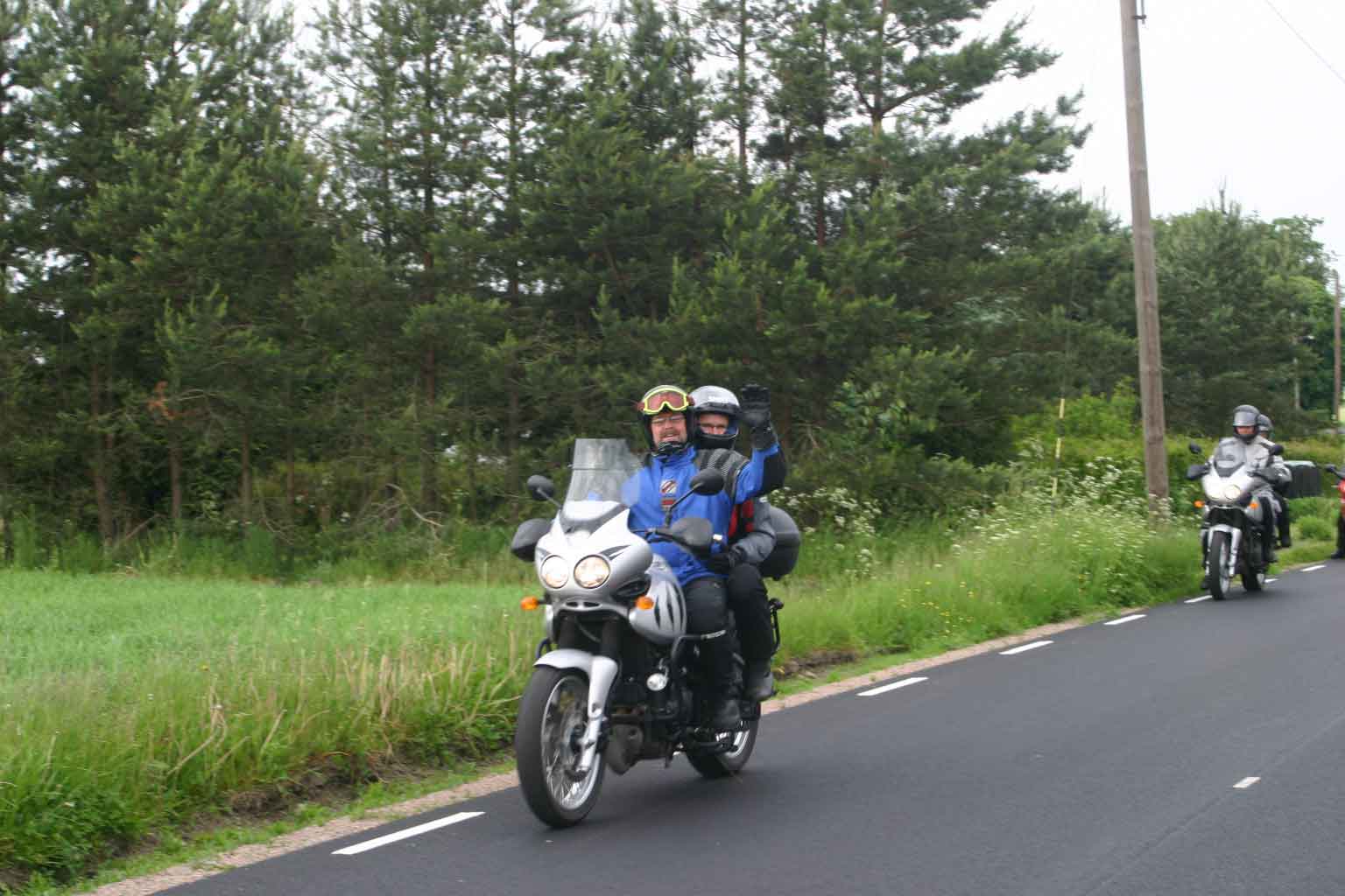 Till slut fick Acke av sej träbonnarna och vi kunde dra iväg på vårt fälttåg. Bitte ledde kolonnen på ledarkatten följt av i stort sett en komplett bukett av Triumph som kröntes av den vackraste och smidigaste klart lysande blomman Sprinten, en maskin perfekt en dag som denna. Aaah va gott det kändes att skriva det sista. Acke låg sist och höll tätt bakåt. Bosse förvarnade alla i omgivningen med sina snabba rappa högerhandsryckningar Vi andra njöt av framfarten på krokiga vägar med kurvor mitt i svängen.