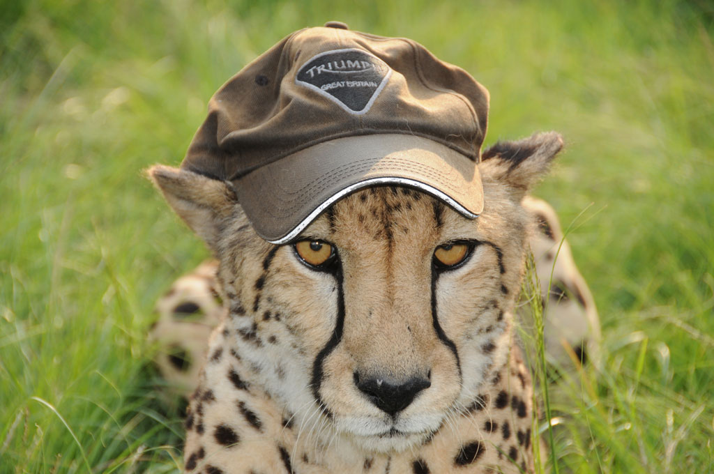 Bifogar en bild på en kisse med Triumph-keps o en bild på mig o Angela.