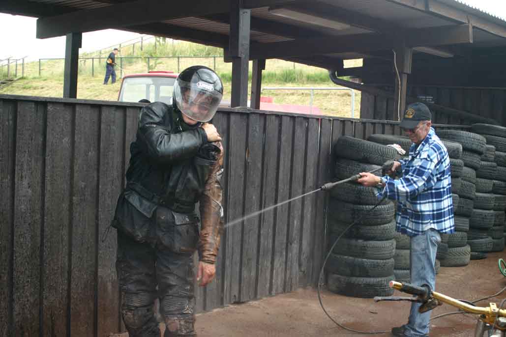 När vi väl kom till heaten med tidtagning öppnade himlen sig för en riktig störtskur så en redan blöt bana blev "snorhal", men detta hindrar ju inte sanna mc-åkare som nu kunde ställa upp sladd även på "rakan". Vinnare blev John Greenfield på 46.34 (erkände efteråt att han tävlat i Speedway) på en överlägsen silverplats kom Ulf Melin på 50.34 (han påstår att han inte kört innan?) och bronset knep Leif Johnsson på 52.53 tätt följd av oss andra med endast tiondelar som skillnad.
