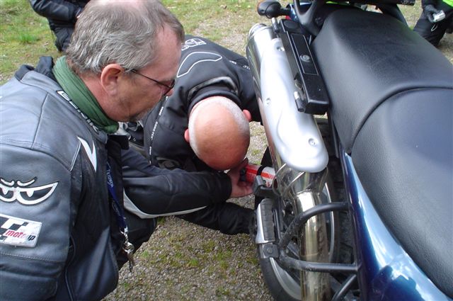 När vi kom tillbaka till parkeringen efter ättestupan hade Rolf N fått ett stick i bakdäcket med motsatt resultat. Inte bra alls, hans Tiger har ekerhjul med slang. Har man tur och då menar jag riktig tur, en sådan som man kanske upplever någon enstaka gång under livet, kan det funka. Friskt vågat och hälften försvunnit, som ordspråket säger. Rolf tömde en burk i hjulet och det såg lovande ut.