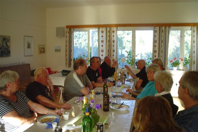 Efter ett antal kakor, glassar och ett otal kaffepåfyllningar, började vi undra var ordförande med sällskap blev av (han visste ju var det var och har alltid GPS och dylikt). När vi hörde det bekanta "trippel-ljudet" tillsammans med något annat oidentifierat ljud förstod vi att det nog blivit en "liten" omväg, eller så övade de att "hitta vilse".